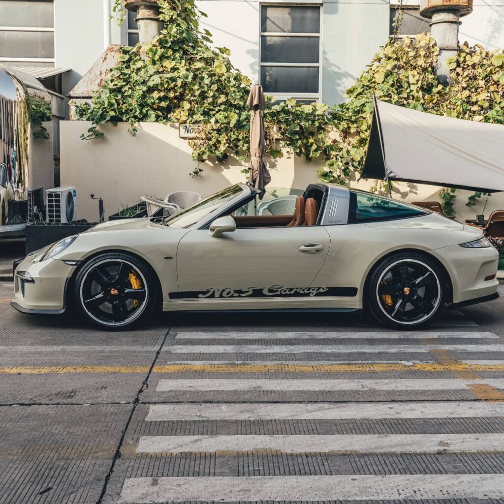 - The “GT” Influence: Notice the aggressive rear bumper venting and the black center-lock-style wheels. By adding these GT3-inspired elements to a Targa body, No. 5 Garage has created a car that looks like it belongs on a track but is built for the scenic route.